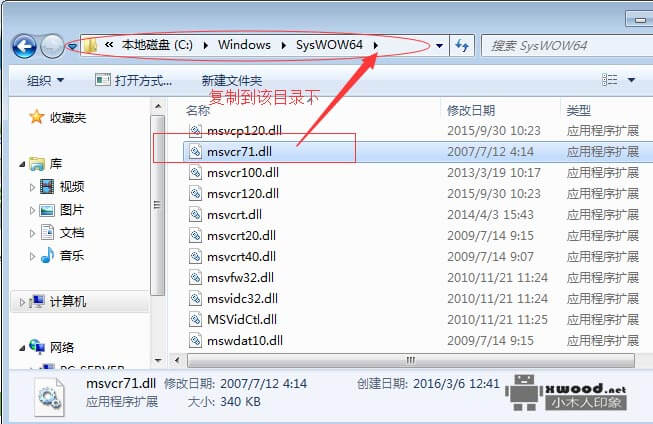 2.将“msvcr71.dll”文件复制到system系统目录,32和64位目录区别如下所示