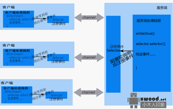 服务器端和客户端各次有自己的时间选择对象Selector,它们通过在通道对象channel上注册想要的事件,进行建立会话通道,到事件发生时,将进行处理响应结果给对方,如下图3-2