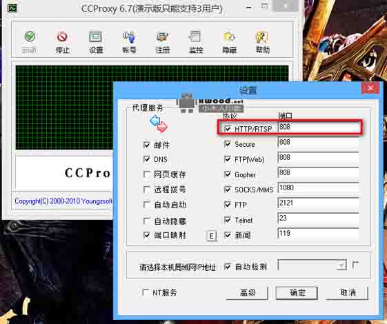1.示例局域网不能上网的服务器先需要访问xwood首页地址,通过借助于局域网172.168.1.8主机(可以有网络访问权限)进行访问上网,在设置代理之前首先确保在172.168.1.8上面运行有代理服务器(如ccproxy,点击下载),并提前配置好代码端口,如下图所示