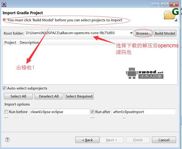7. 如下图,选择源码解压包路径,之后出现“You must click ..”错误提示,再点击“Build Model”按钮