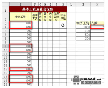 例:快速统计指定区域内的人员学历工资为1000的人数。