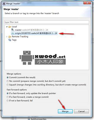 2.4 选择需要合并到主干的分支(如选择20180705),点击Merge按钮,后面界面OK