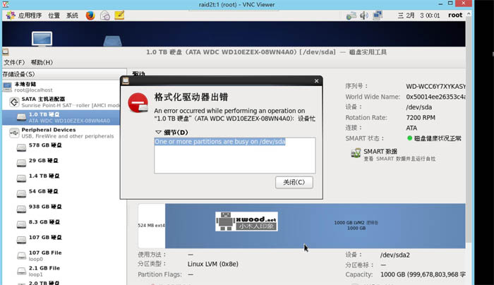 解决centos系统报"磁盘格式化驱动器出错"An error occurred while performing an operation on 1.0TB 硬盘(ATA WDC WD10EZEX-08WN4A0):设备忙..One or more partitions are busy on /dev/sda...mount: unknown filesystem type 'LVM2_member'"错误(如下图)