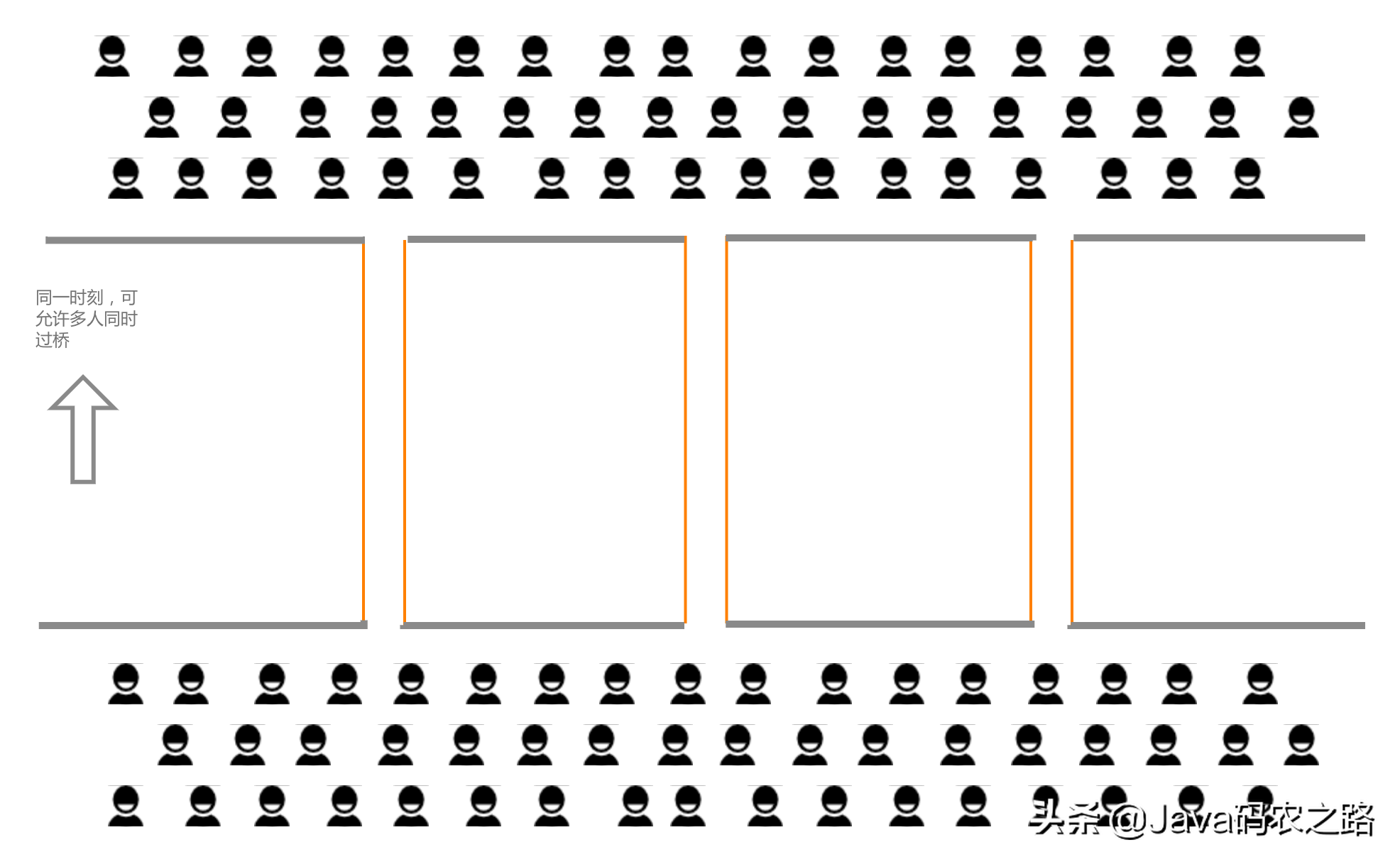 共享锁其实是相对独占锁而言的,涉及到共享锁就要聊到并发度,即同一时刻最多允许同时执行线程的数量。上图所述的并发度为3,即在同一时刻,最多可有3个人在同时过河。