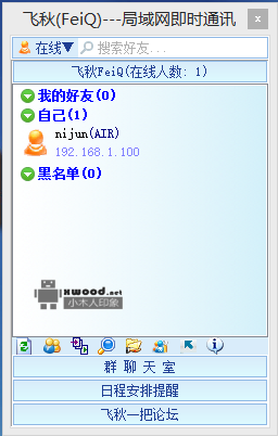 飞秋(FeiQ)是一款局域网聊天传送文件的绿色免费软件,它参考了飞鸽传书(IPMSG)和QQ, 完全兼容飞鸽传书(IPMSG)协议,具有局域网传送方便,速度快,操作简单的优点,具有QQ中最基础的聊天常用功能。